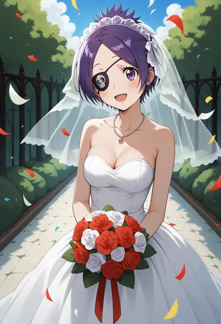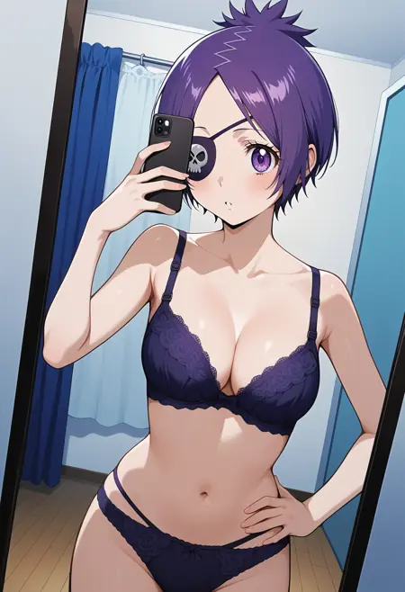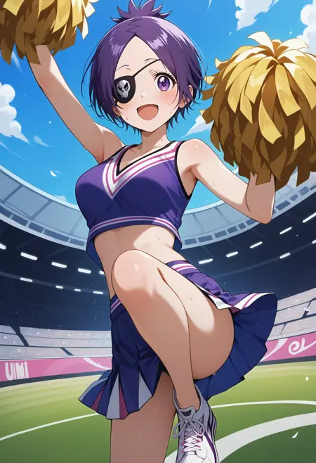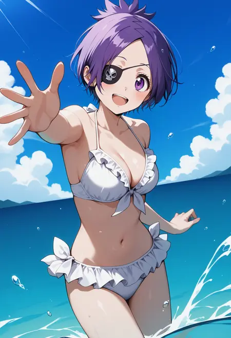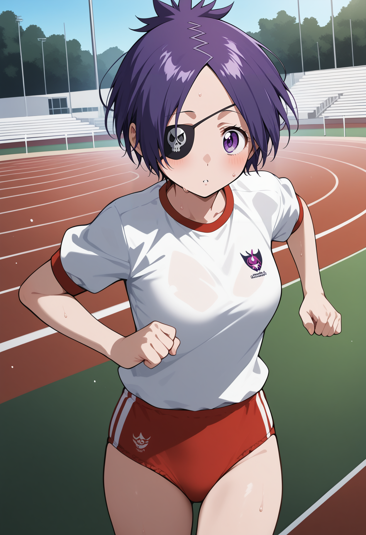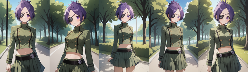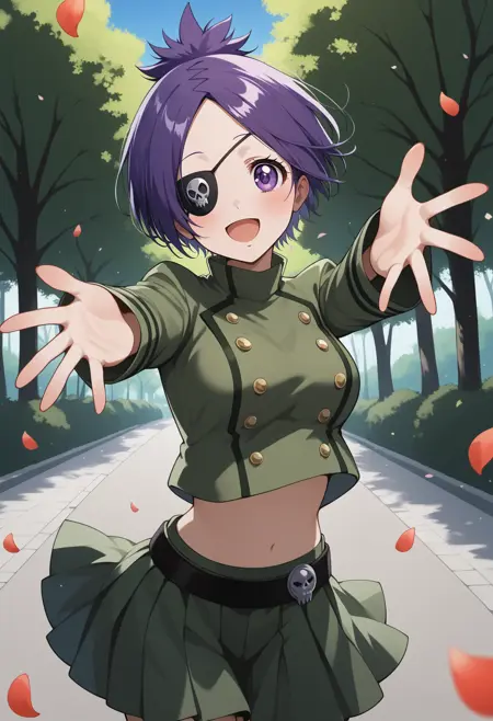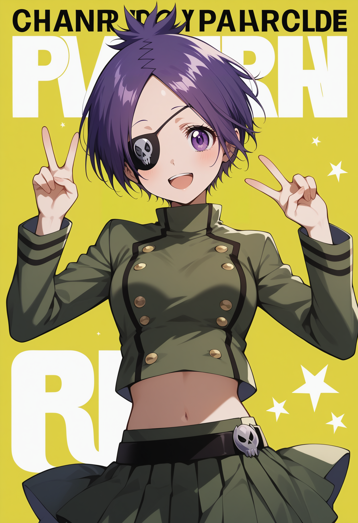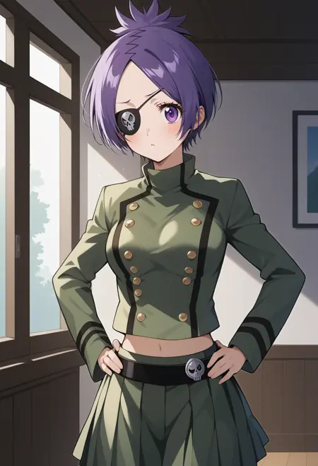aadokuro, short hair, purple hair, purple eyes, eyepatch, breasts, green shirt, long sleeves, buttons, midriff, belt, miniskirt, green skirt