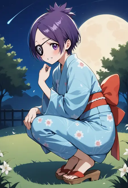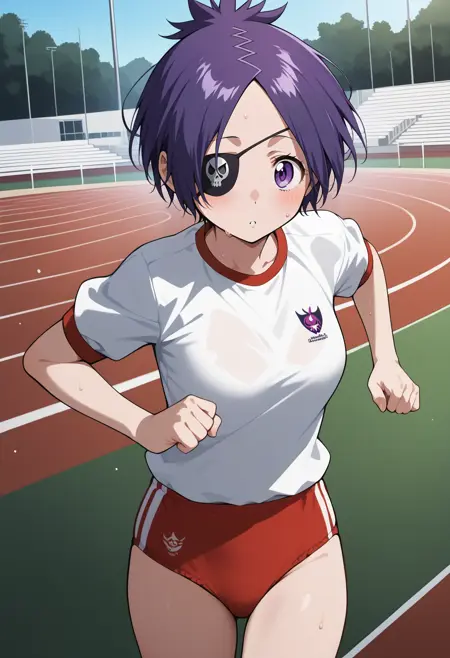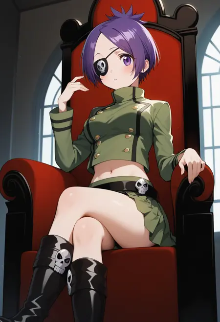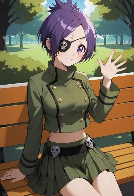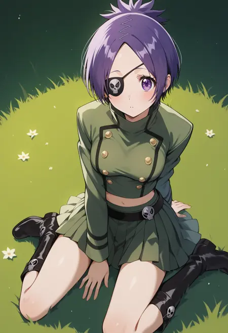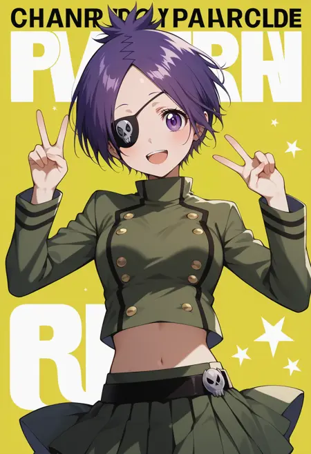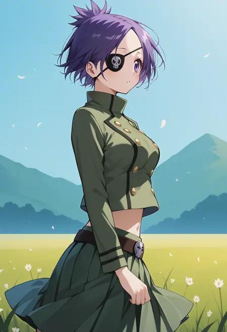 outfit1aadokuro, short hair, purple hair, purple eyes, eyepatch, breasts, green shirt, long sleeves, buttons, midriff, belt, miniskirt, green skirt