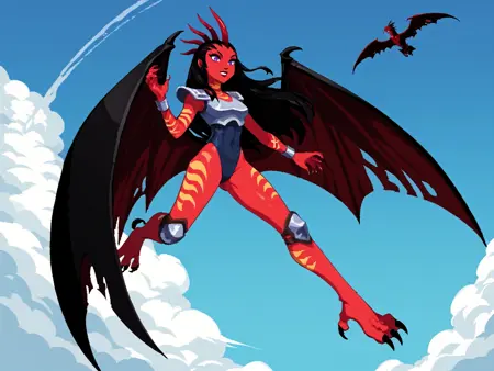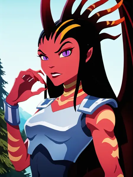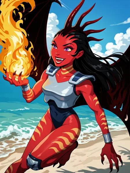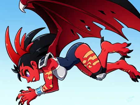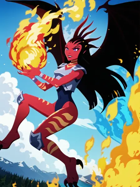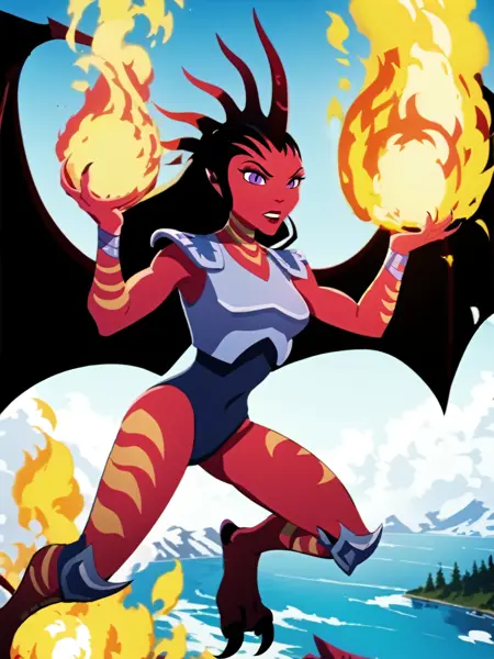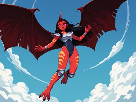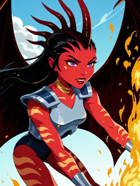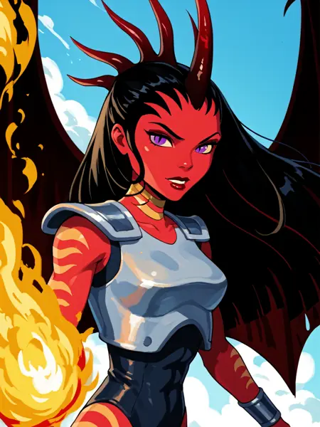 一般的な外見: 1girl, demon girl, solo, tattoo, orange tattoo, neck tattoo, arm tattoo, leg tattoo, red skin, colored skin, horns, black hair, long hair, forehead, purple eyes, black pupils, slit pupils, makeup, lipstick, armor, shoulder pads, breastplate, blue leotard, leotard, bracelet, silver bracelet, knee guards, claws, talons, wings, demon wings,