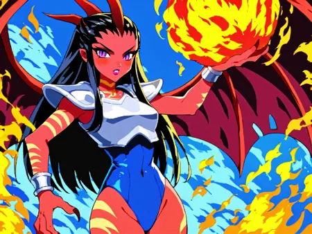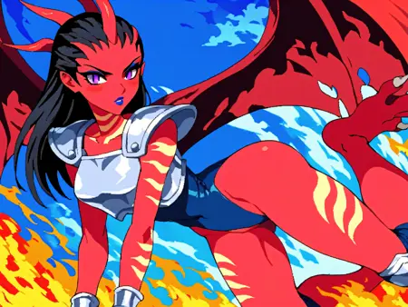 整体外观: 1girl, 恶魔女孩, 单人, 纹身, 橙色纹身, 颈部纹身, 手臂纹身, 腿部纹身, 红色皮肤, 彩色皮肤, 角, 黑色头发, 长发, 额头, 紫色眼睛, 黑色瞳孔, 竖瞳, 妆容, 唇膏, 护甲, 肩甲, 胸甲, 蓝色紧身衣, 紧身衣, 手镯, 银色手镯, 膝甲, 爪子, 爪尖, 翅膀, 恶魔翅膀,