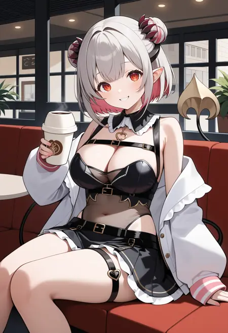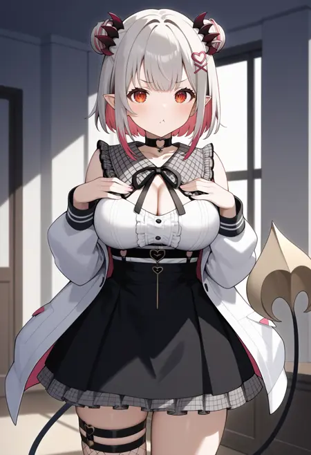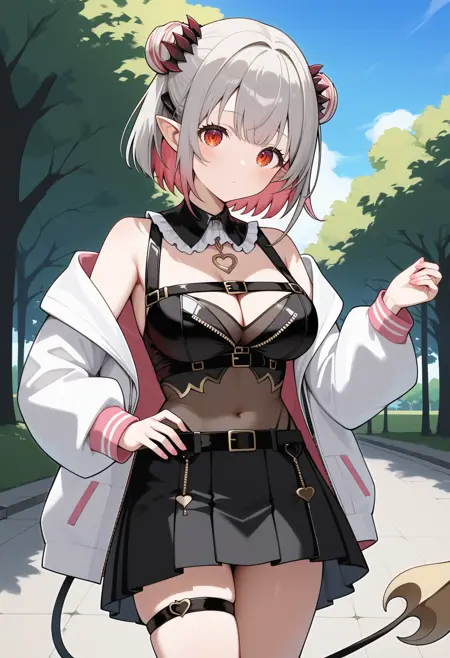 outfit5ddpatra, short hair, multicolored hair, double bun, pointy ears, red eyes, demon tail, large breasts, detached collar, cleavage, black leotard, off shoulder, white jacket, open jacket, long sleeves, see-through, black belt, black skirt, thigh strap