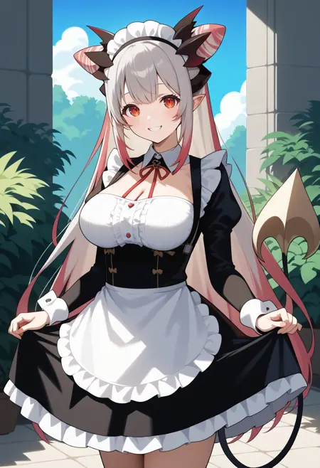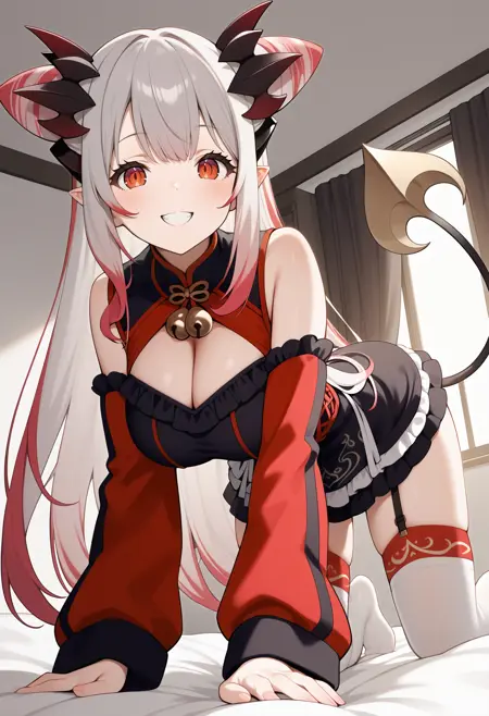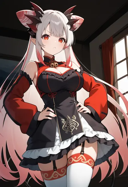 outfit2aapatra, long hair, multicolored hair, cone hair bun, horns, pointy ears, red eyes, large breasts, demon tail, neck bell, frills, cleavage cutout, black dress, sleeveless, detached sleeves, red sleeves, garter straps, white thighhighs