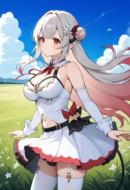 outfit6eepatra, long hair, multicolored hair, double bun, hair ornament, hair flower, pointy ears, red eyes, demon tail, large breasts, neck ribbon, cleavage, white dress, detached sleeves, white sleeves, navel cutout, garter straps, white thighhighs