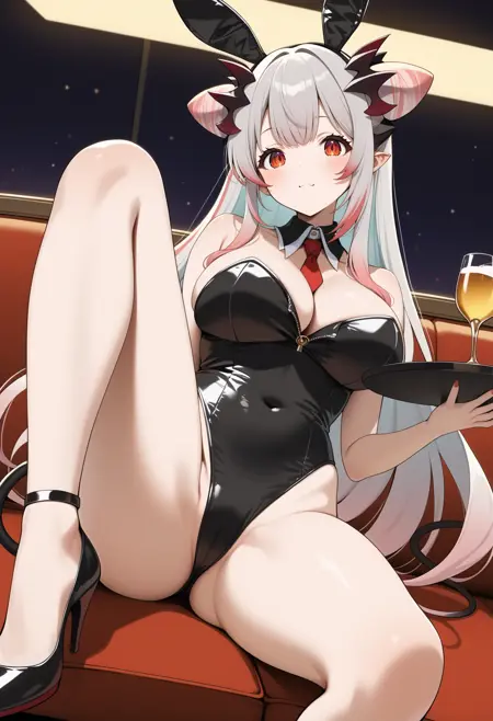 outfit1aapatra, long hair, multicolored hair, cone hair bun, horns, pointy ears, red eyes, large breasts, demon tail, red necktie, cleavage, crop top, black shirt, vest, detached sleeves, black sleeves, midriff, red belt, black skirt, black thighhighs