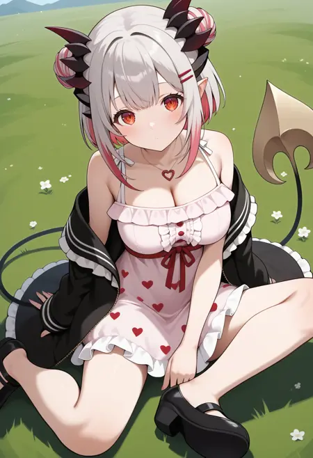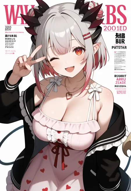 outfit3bbpatra, short hair, multicolored hair, double bun, horns, hairclip, pointy ears, red eyes, large breasts, demon tail, necklace, bare shoulders, cleavage, heart print, frilled dress, pink dress, red ribbon, off shoulder, black jacket, open jacket
