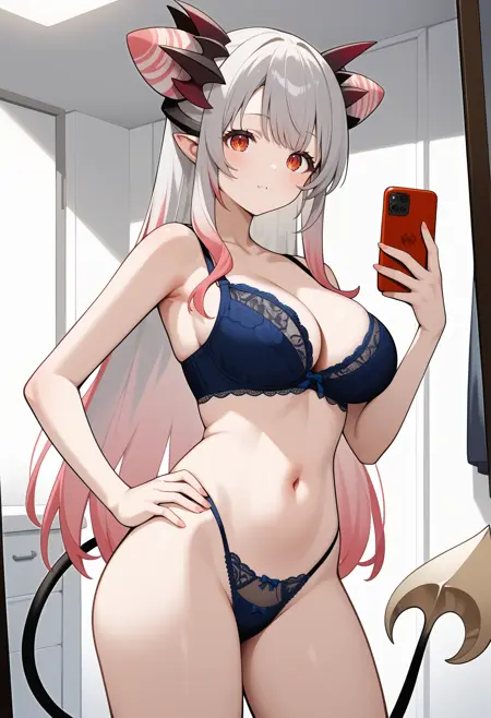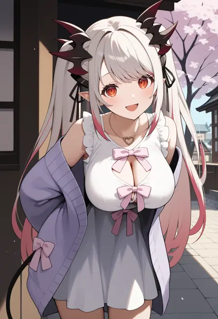 outfit4ccpatra, long hair, multicolored hair, twintails, horns, hair ribbon, swept bangs, pointy ears, red eyes, large breasts, demon tail, necklace, cleavage cutout, white dress, pink bow, off shoulder, purple cardigan, open clothes, sleeves past wrists