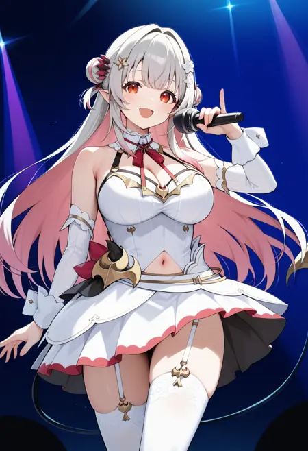 outfit7ffpatra, short hair, multicolored hair, double bun, hair ornament, pointy ears, red eyes, large breasts, black choker, frilled collar, neck ribbon, cleavage cutout, white shirt, sleeveless, off shoulder, white jacket, open jacket, long sleeves, black skirt, thigh strap, fishnet, single thighhigh