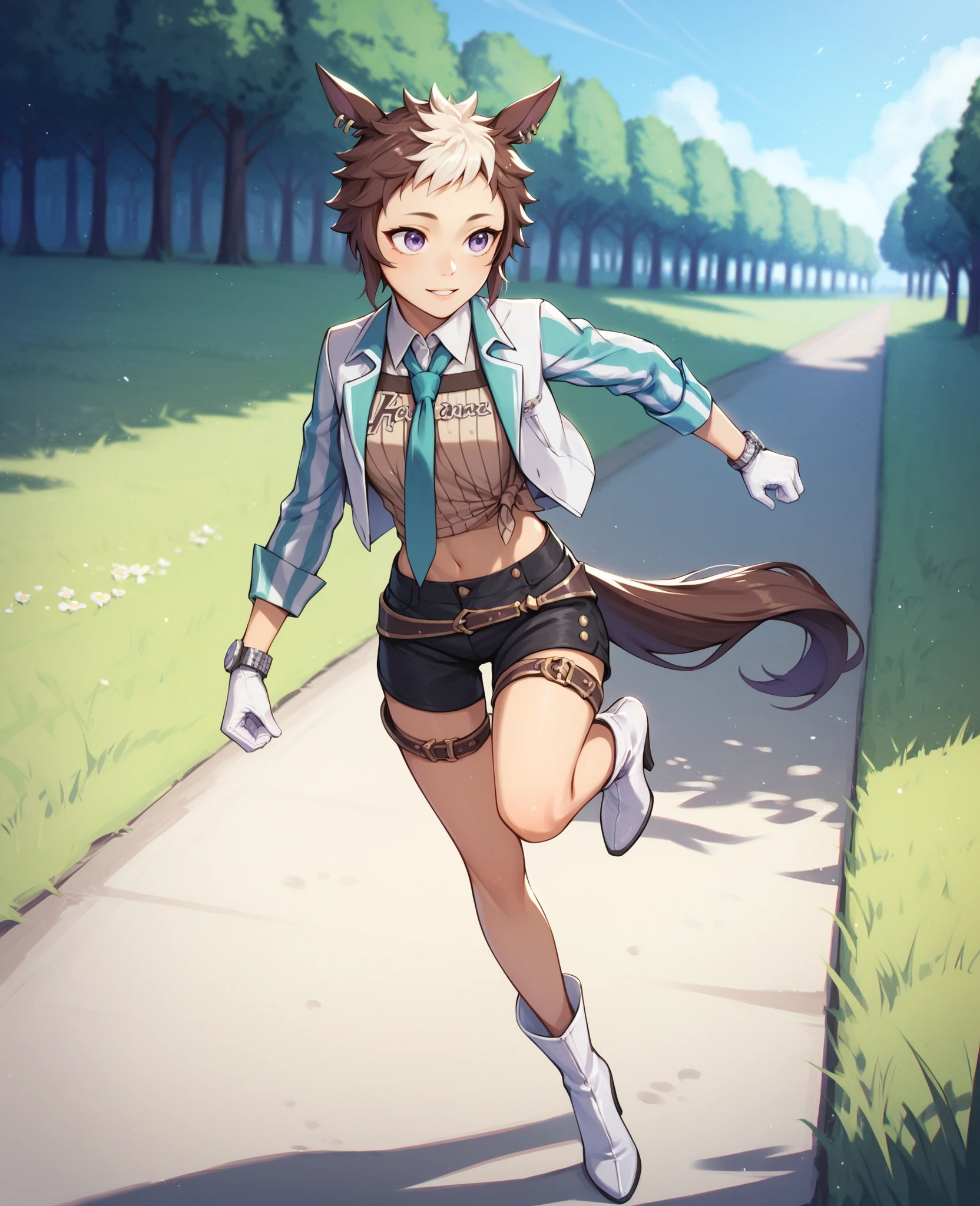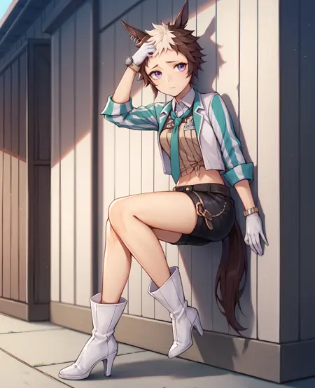 Outfit: Collared shirt, long sleeves, necktie, white gloves, jacket, black shorts, high heel boots, belts