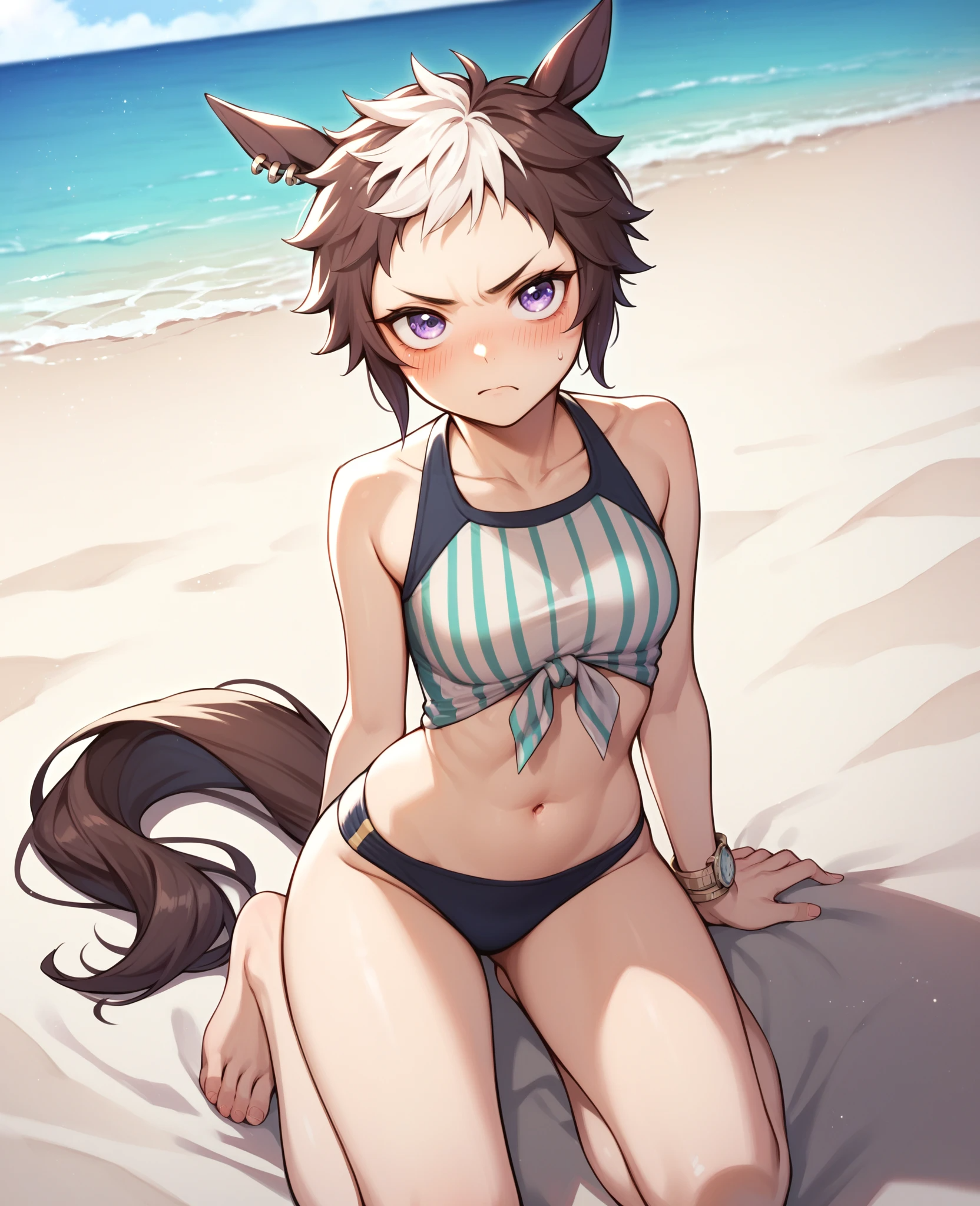 Appearance: Mej1roRy4n, 1girl, brown hair, horse girl, animal ears, horse ears, horse tail, short hair, two tone hair, purple eyes