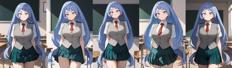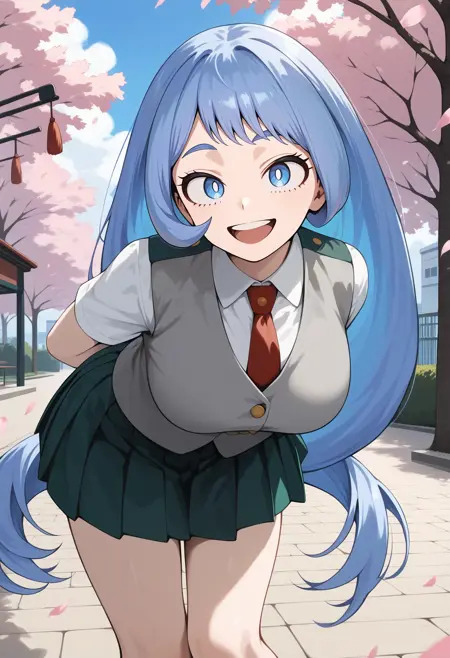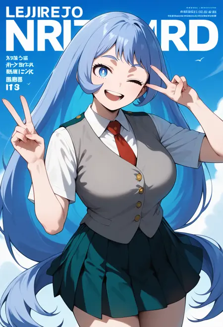 aanejire, long hair, blue hair, blue eyes, large breasts, school uniform, red necktie, collared shirt, white shirt, grey vest, short sleeves, pleated skirt, green skirt