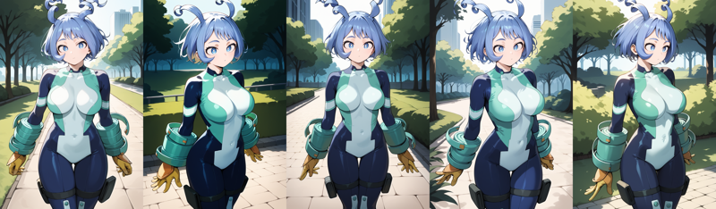 aanejire, short hair, blue hair, hair horns, blue eyes, large breasts, skin tight, multicolored bodysuit, green arm guards, yellow gloves, thigh strap