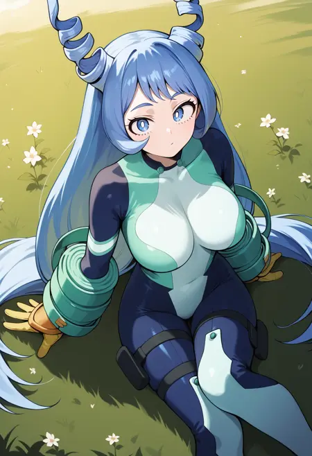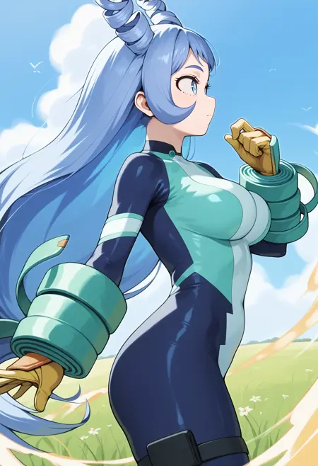 outfit1aanejire, long hair, blue hair, hair horns, drill hair, blue eyes, large breasts, skin tight, multicolored bodysuit, green arm guards, yellow gloves, thigh strap