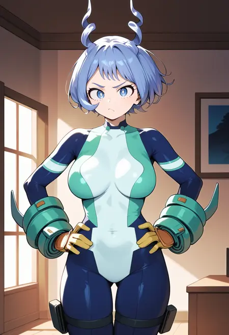 outfit1-1 (short hair)aanejire, short hair, blue hair, hair horns, blue eyes, large breasts, skin tight, multicolored bodysuit, green arm guards, yellow gloves, thigh strap