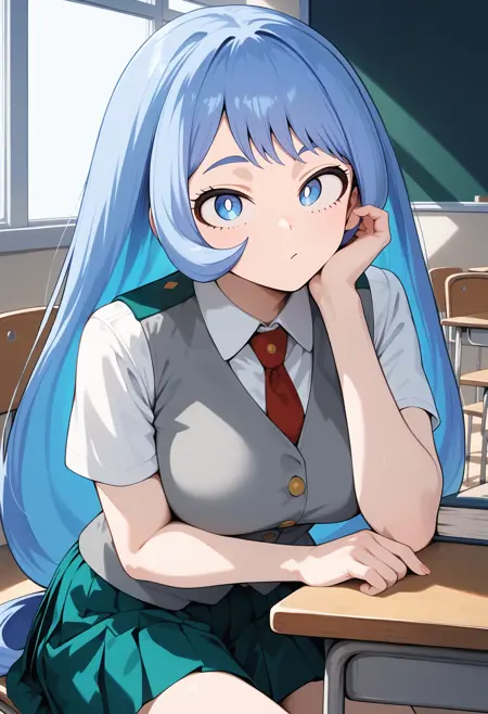 outfit2aanejire, long hair, blue hair, blue eyes, large breasts, school uniform, red necktie, collared shirt, white shirt, grey vest, short sleeves, pleated skirt, green skirt