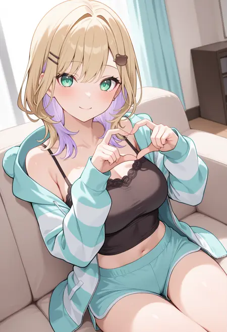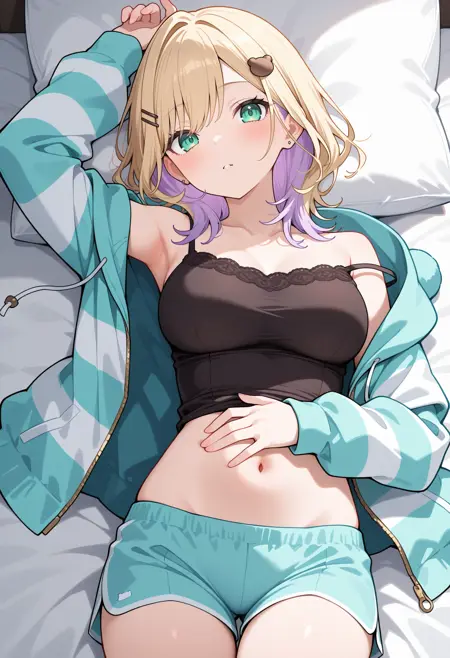 outfit3noah3, medium hair, blonde hair, purple hair, hairclip, bear hair ornament, green eyes, breasts, black camisole, off shoulder, hoodie, striped jacket, aqua jacket, long sleeves, midriff, aqua shorts