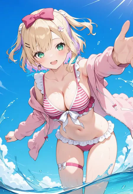outfit7noah7, short hair, blonde hair, purple hair, two side up, green eyes, hair bow, hairclip, breasts, cleavage, frilled bikini, striped bikini, off shoulder, pink jacket, open jacket, long sleeves, thigh strap