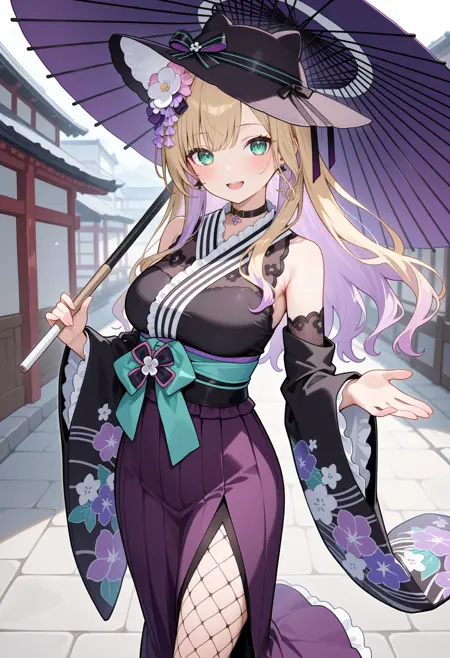 outfit5noah5, long hair, blonde hair, purple hair. black headwear, hat bow, hair flower, green eyes, breasts, black choker, frills, floral print, black kimono, sleeveless, detached sleeves, wide sleeves, sash, long skirt, purple skirt, fishnet pantyhose
