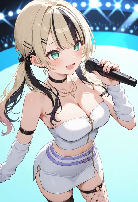 outfit6noah6, long hair, blonde hair, streaked hair, twintails, hairclip, hair ornament, green eyes, breasts, black choker, necklace, cleavage, white shirt, strapless, arm strap, arm warmers, midriff, belt, white skirt, thigh strap, single thighhigh, fishnet thighhighs