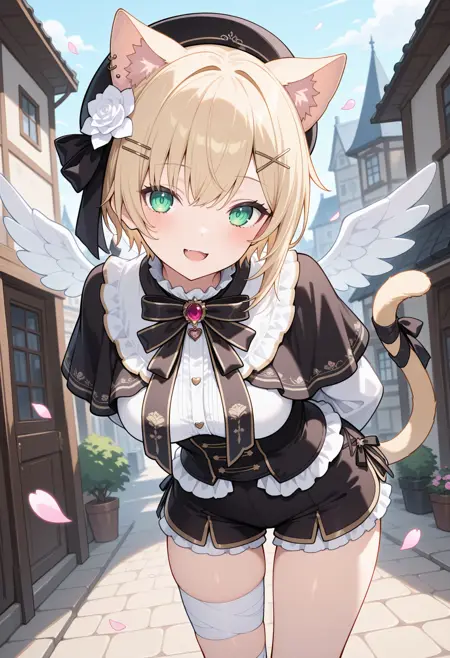 outfit2noah2, short hair, blonde hair, cat ears, beret, black headwear, hairclip, x hair ornament, hair flower, green eyes, wings, breasts, cat tail, tail ribbon, black bowtie, frills, capelet, white shirt, long sleeves, corset, black shorts, bandaged leg,