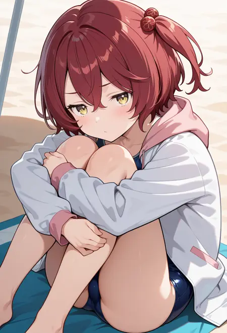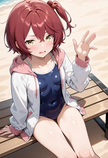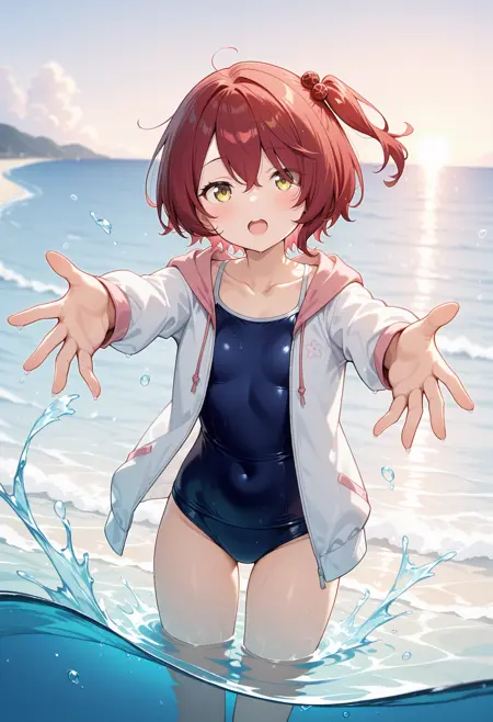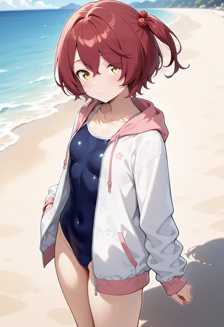 aakomari, short hair, red hair, one side up, hair bobbles, blue one-piece swimsuit, hooded jacket, white jacket, open jacket, long sleeves