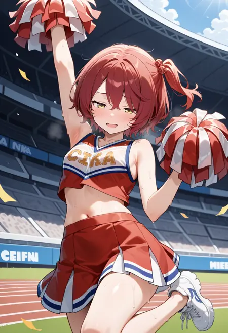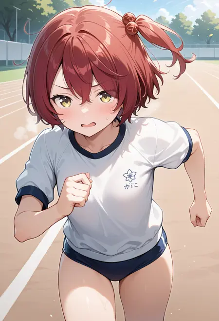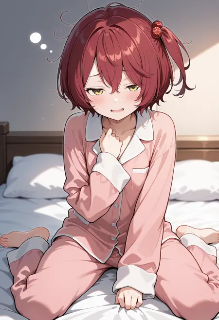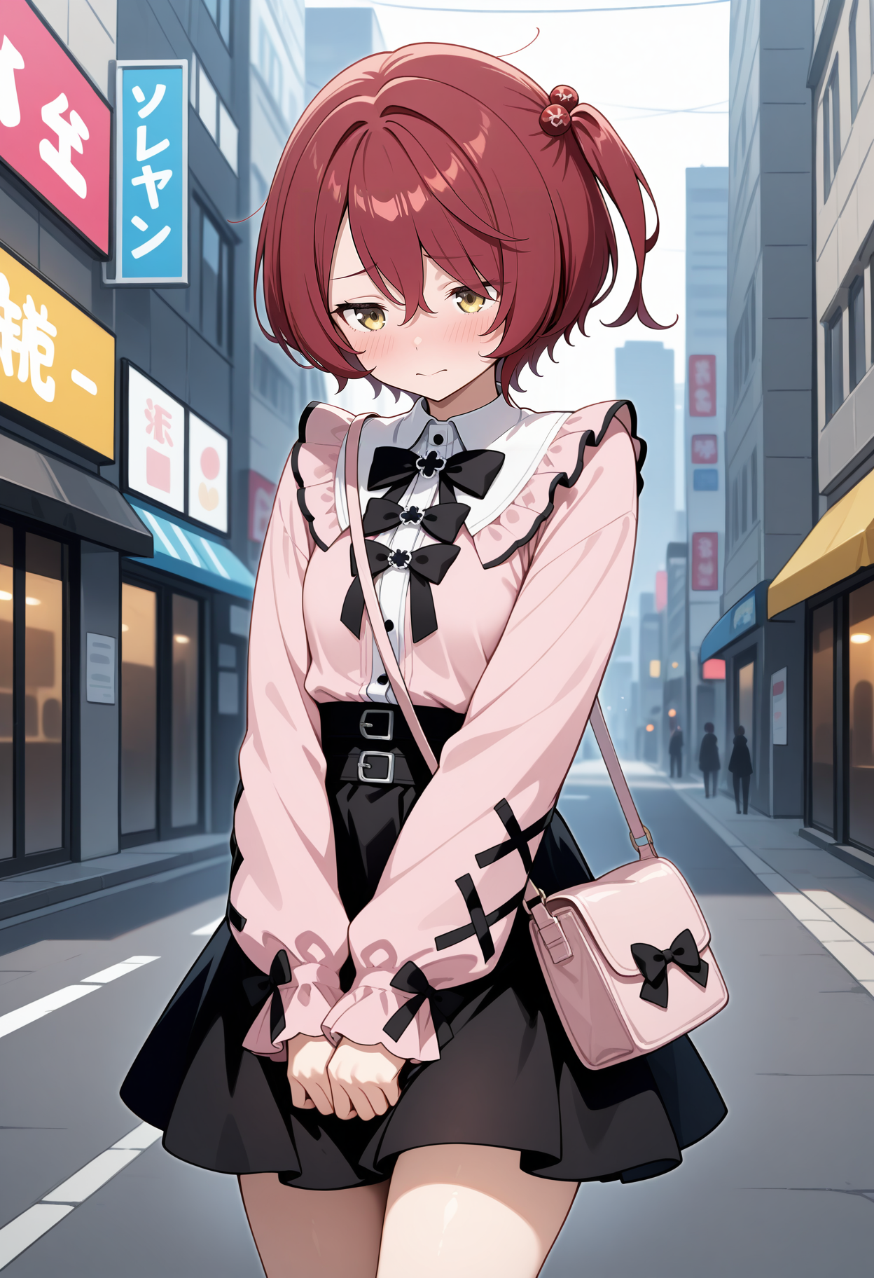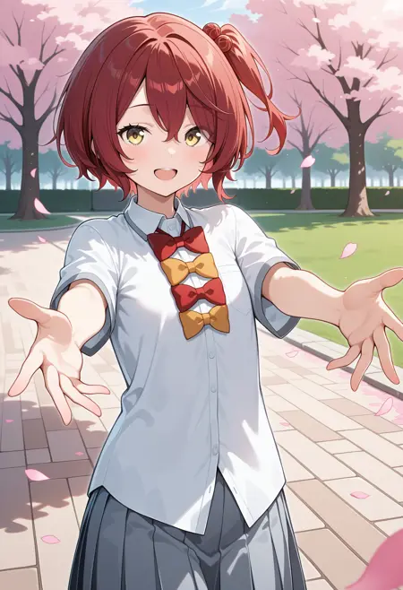 aakomari, short hair, red hair, one side up, hair bobbles, school uniform, red bow, yellow bow, collared shirt, white shirt, untucked shirt, short sleeves, pleated skirt, grey skirt