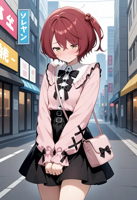 outfit1aakomari, short hair, red hair, one side up, hair bobbles, school uniform, red bow, yellow bow, collared shirt, white shirt, untucked shirt, short sleeves, pleated skirt, grey skirt