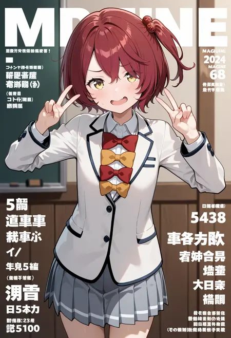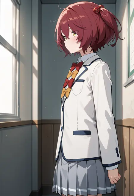 outfit2aakomari, short hair, red hair, one side up, hair bobbles, school uniform, red bow, yellow bow, collared shirt, blazer, white jacket, long sleeves, pleated skirt, grey skirt