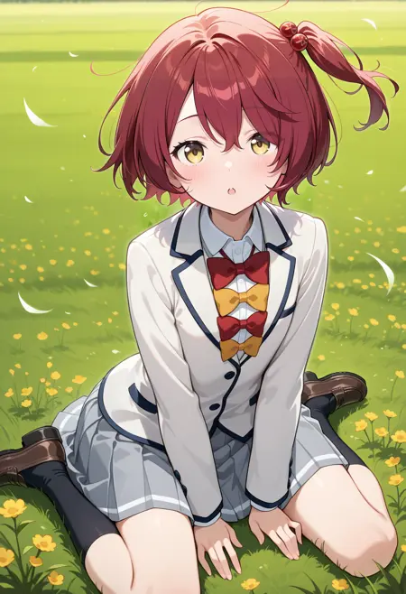 aakomari, short hair, red hair, one side up, hair bobbles, school uniform, red bow, yellow bow, collared shirt, blazer, white jacket, long sleeves, pleated skirt, grey skirt