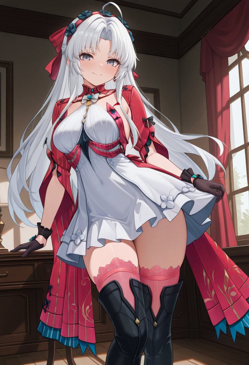 carlotta, 1girl, long hair, dress, white hair, gloves, black gloves, parted bangs, thighhighs, ahoge, white dress, boots, grey eyes, pink thighhighs, black footwear, (black thigh boots), jewelry, hairband, high heel boots, red dress, thighs