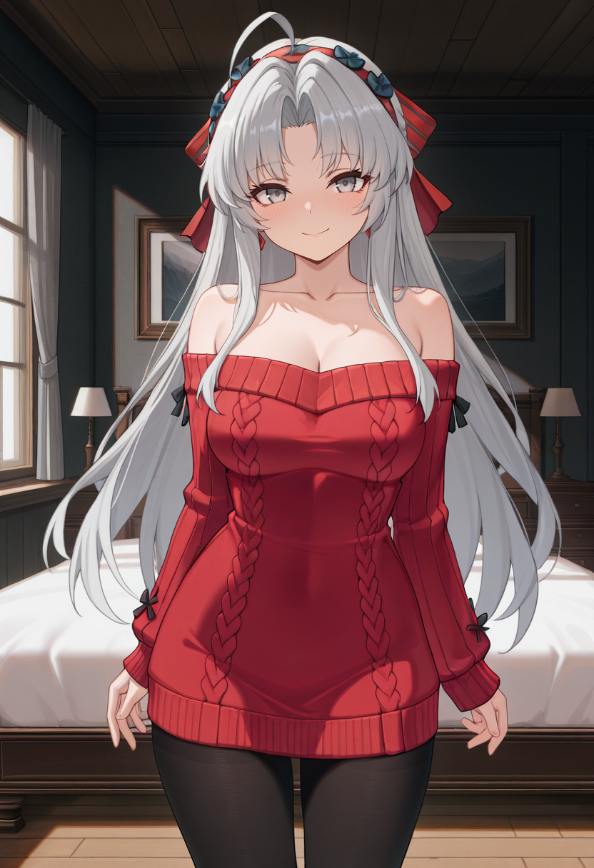 carlotta, 1girl, long hair, parted bangs, ahoge, grey eyes, hairband, white hair