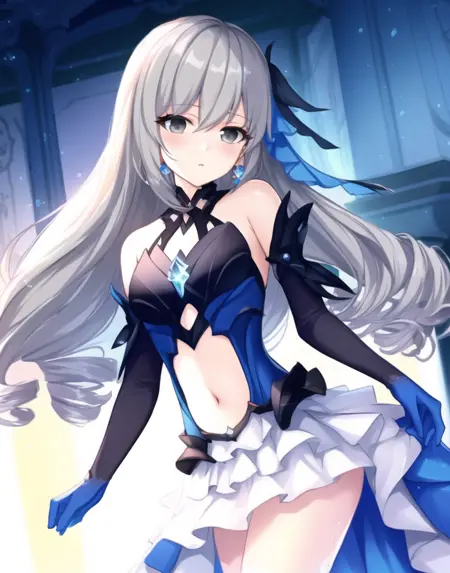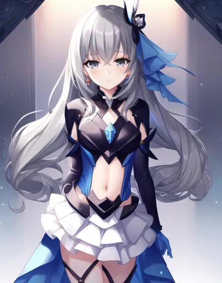 long hair,grey eyes,hair accessories blue,pleated skirt,