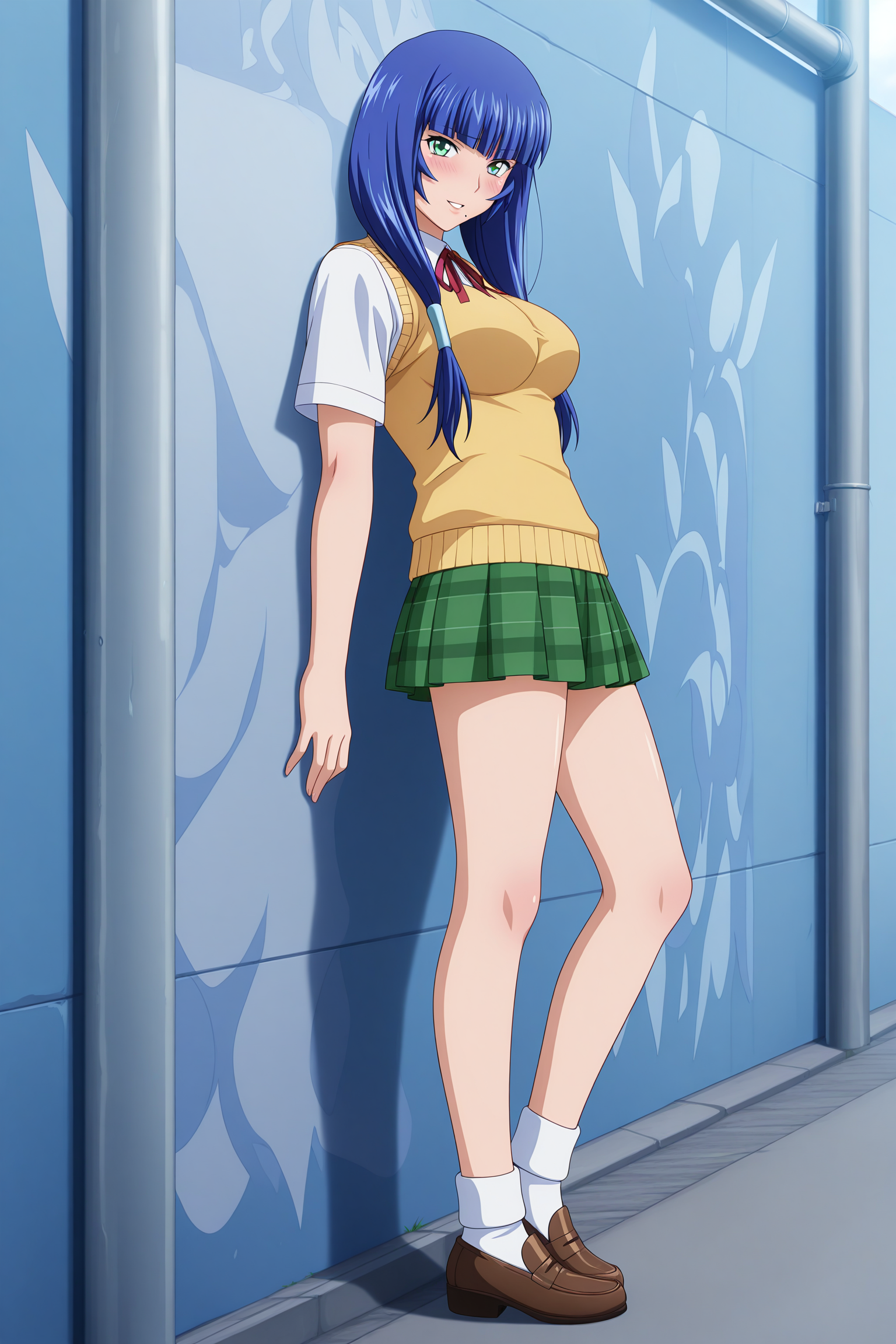 ryomou shimei, 长发, 蓝发, 低双马尾, 发圈, 齐刘海, 绿眼, 嘴下有痣, 短袖, 白衬衫, 有领衬衫, 红丝带, 颈部丝带, 黄色毛背心, 绿色裙子, 格子裙, 百褶裙, 白色袜子, 船袜, 棕色鞋履, 乐福鞋