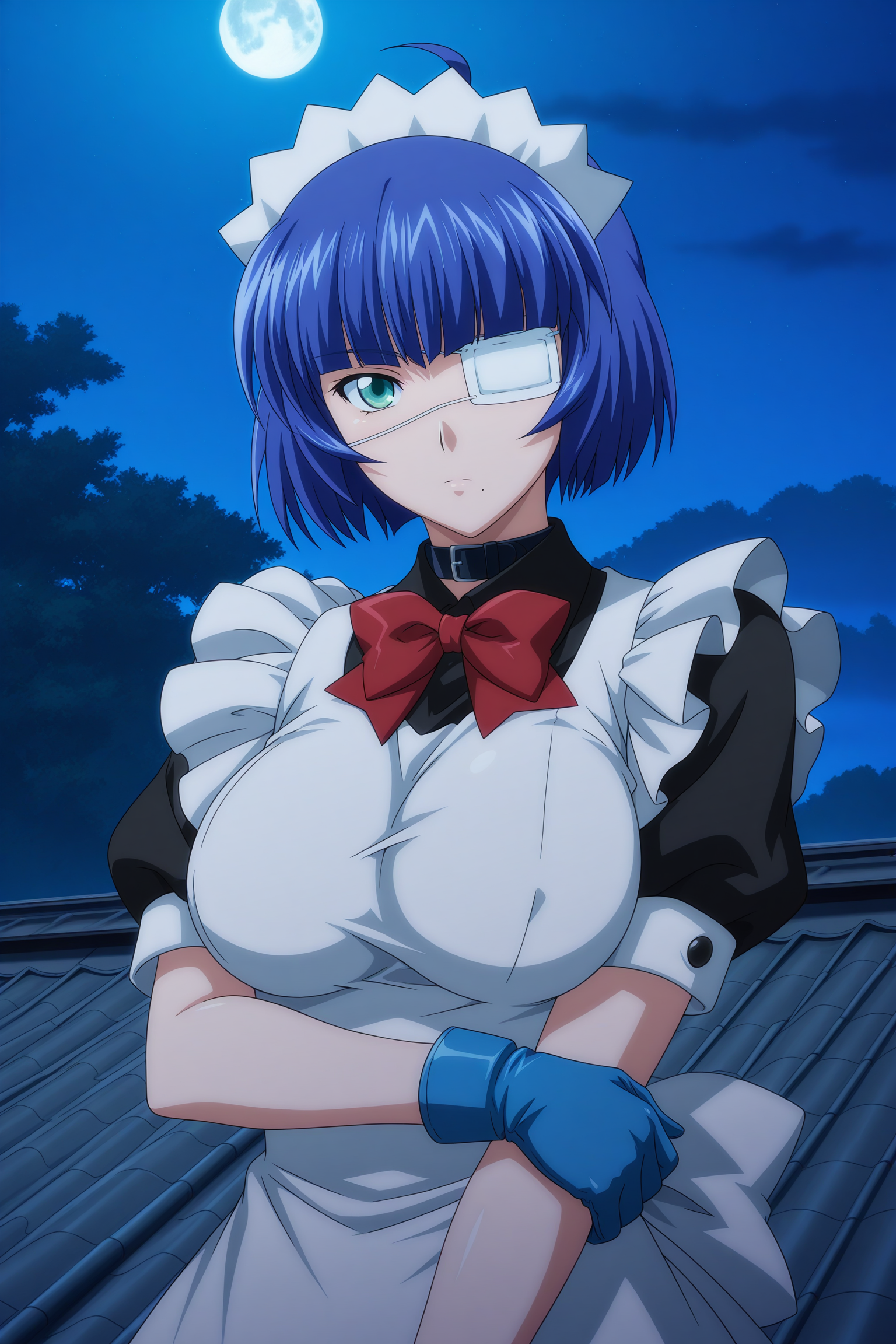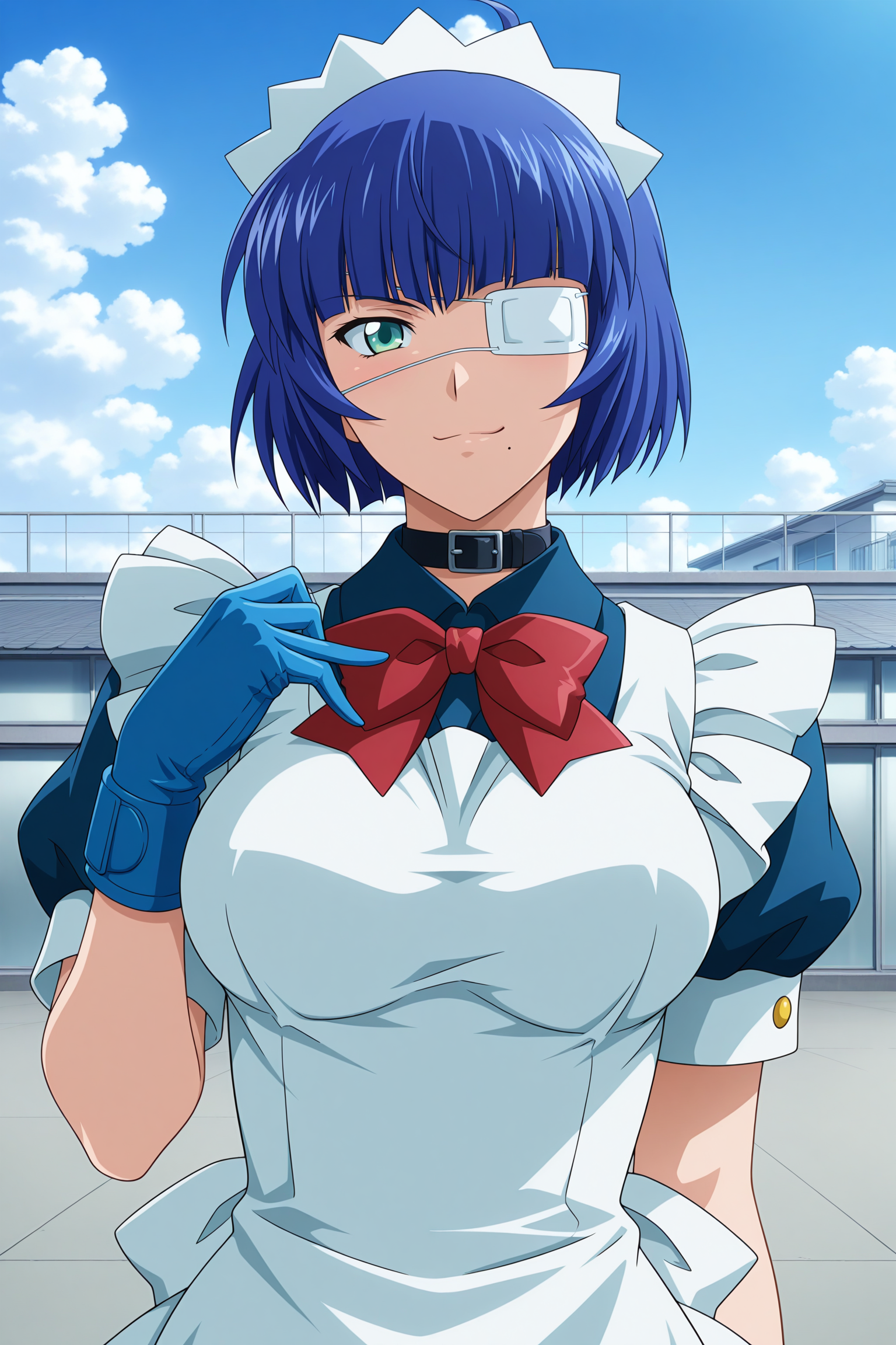 ryomou shimei, 短发, 蓝发, 天线辫, 齐刘海, 绿眼, 医用眼罩, 嘴下有痣, 女仆, 短袖, 女仆头饰, 黑色领圈, 红领结, 女仆围裙, 背部蝴蝶结, 黑色连衣裙, 蓝色手套, 白色过膝袜, 黑色鞋履, 靴子