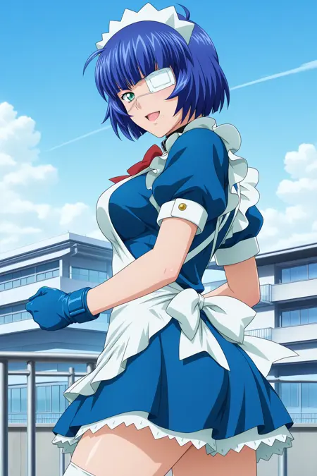 ryomou shimei, 短发, 蓝发, 天线辫, 齐刘海, 绿眼, 医用眼罩, 嘴下有痣, 女仆, 短袖, 女仆头饰, 黑色领圈, 红领结, 女仆围裙, 背部蝴蝶结, 蓝色连衣裙, 蓝色手套, 白色过膝袜, 蓝色鞋履, 靴子