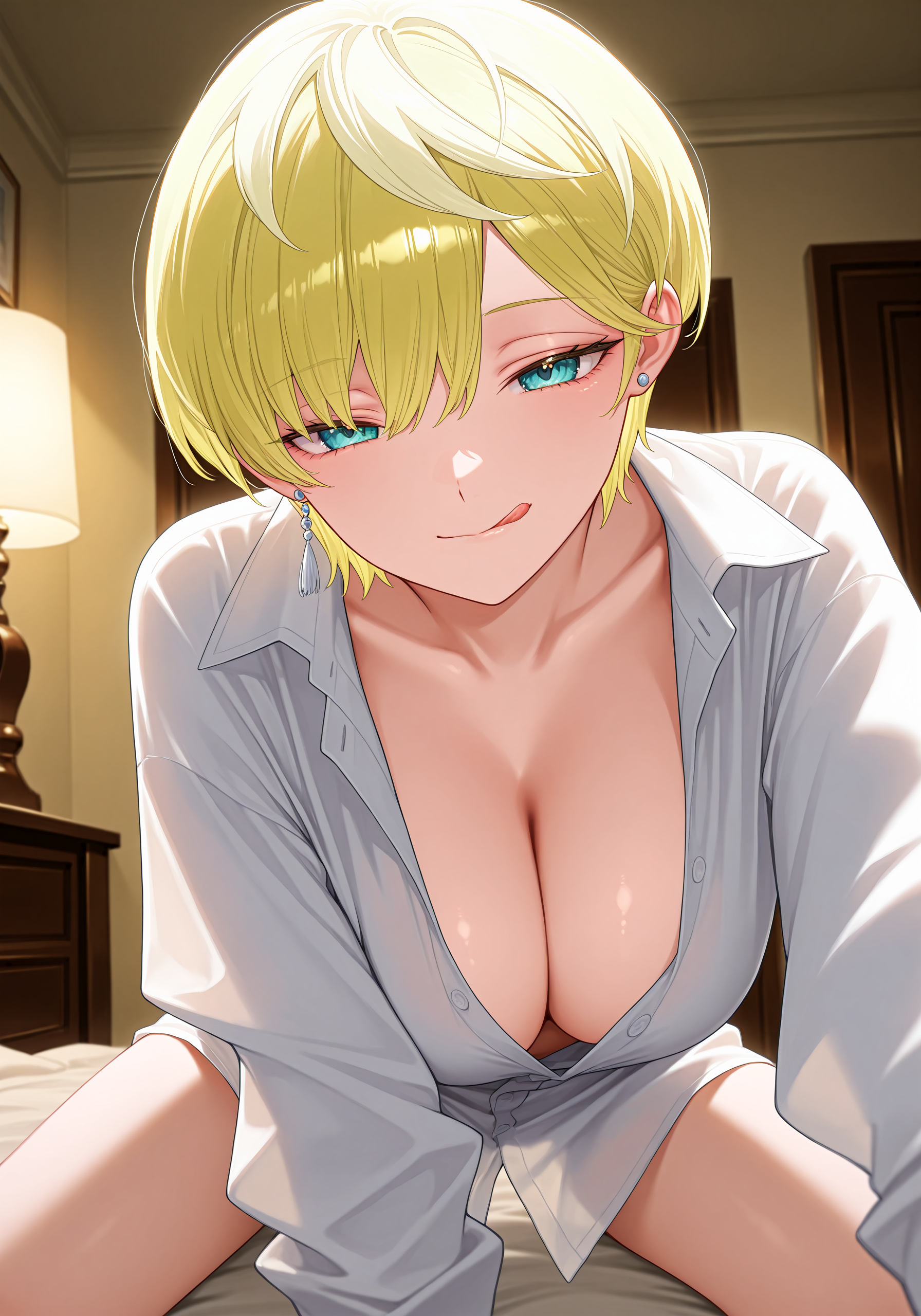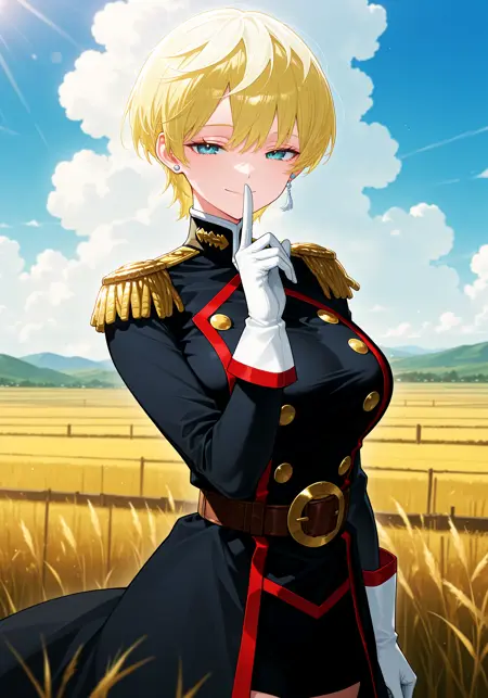 군복 드레스, 어깨장식, 검은 짧은 바지, 갈색 벨트, 흰 장갑, 검은 허벅지 부츠