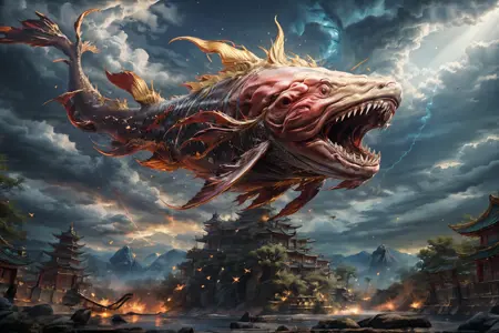 물고기 그리기: kun, masterpiece, ultra high resolution, exquisite details, open your mouth, sharp teeth, slow loris, whale, dragon