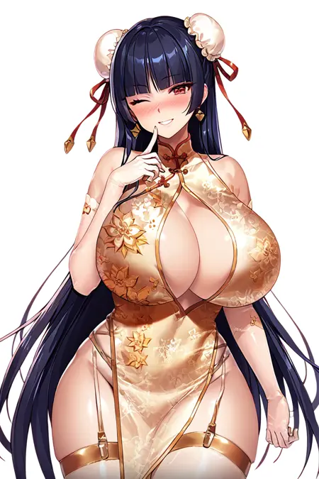 china dress,chinese clothes,cleavage cutout,garter straps,see-through,elbow gloves,thighhighs,bare shoulders,ribbon,double bun, bun cover,
