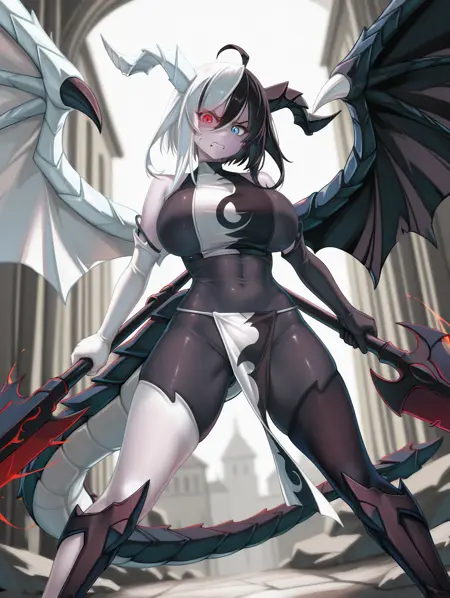 Koron, horns, split-color hair, 1 white horn, 1 black horn, white hair, black hair, ahoge, colored skin, heterochromia, red eye, blue eye, (glowing eyes), dragon tail, dragon girl, white scales, dragon wings, dragon feets, large breasts, bodysuit, pelvic curtain, white thighhig, black thighhig, white elbow glove, black elbow glove, off shoulders,