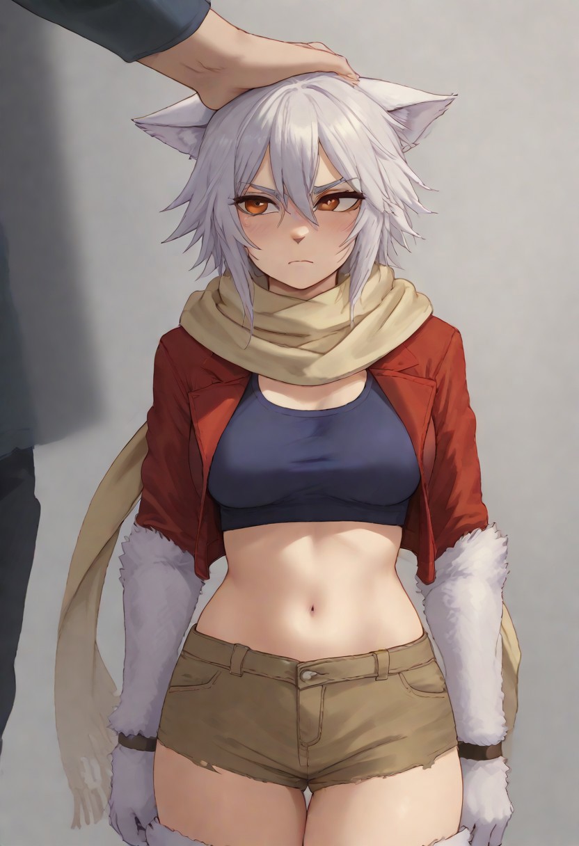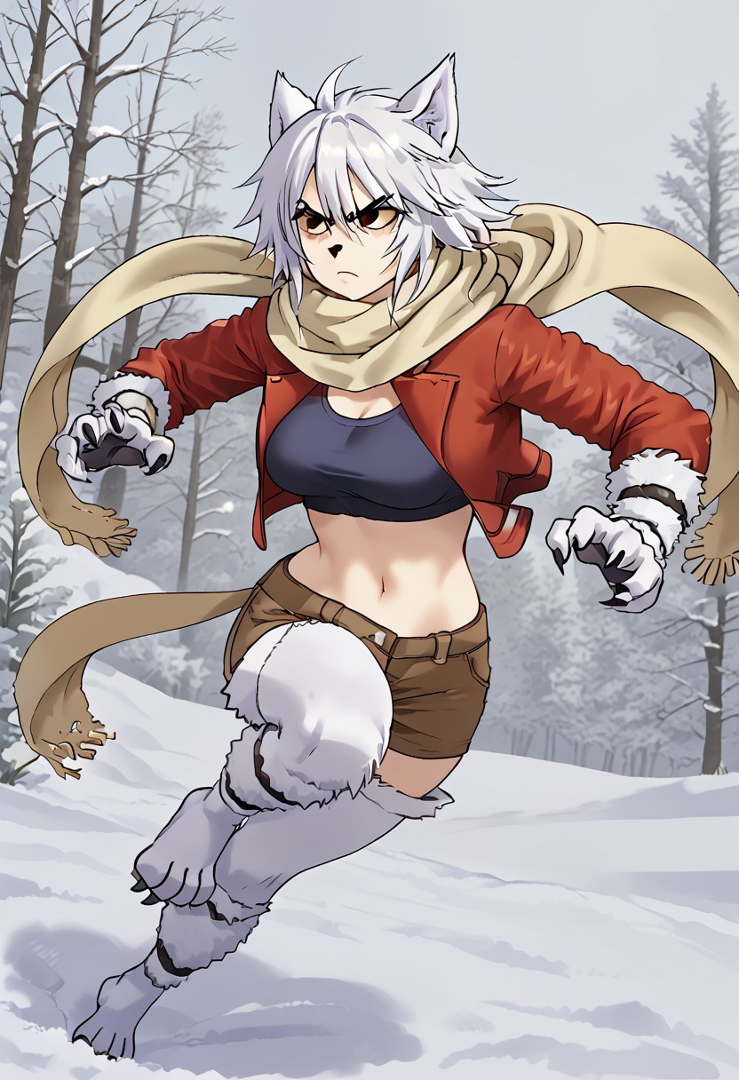 옷 관련 키워드: 빨간 재킷, 짧은 상의, 갈색 반바지, 스카프, 팔밴드, 다리밴드