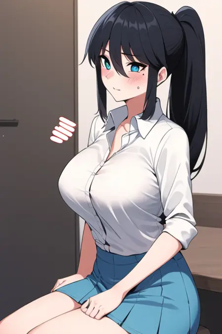sia, シングル, ローポニーテール, 前髪, 黒髪, 青い目, 胸, 目の間の髪