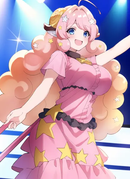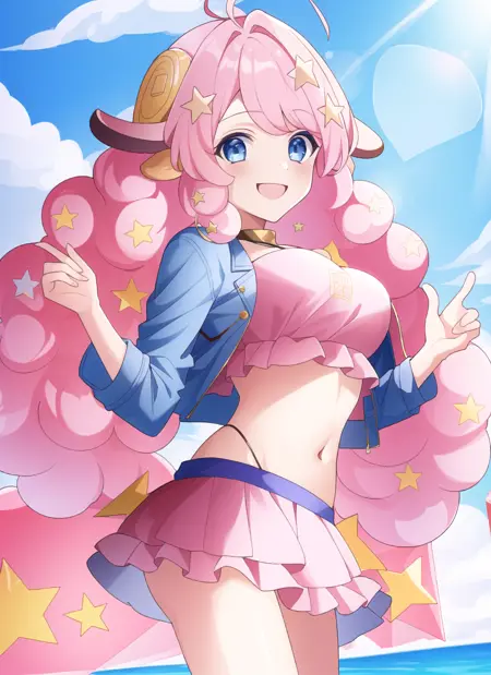 예: 1girl,solo,huge_breasts,pink hair,long hair,star (symbol),hair ornament,blue eyes,star hair ornament,horns,animal ears,smile,sheep horns,ahoge,