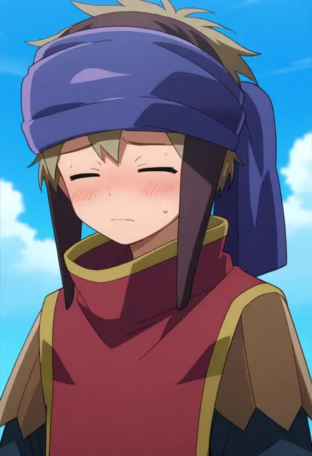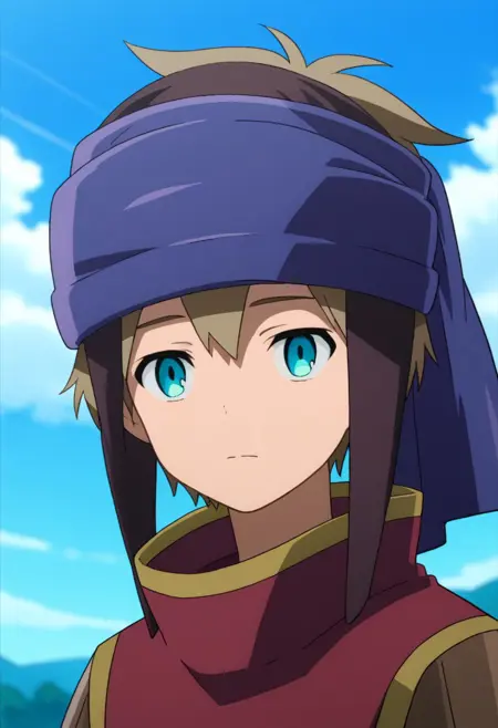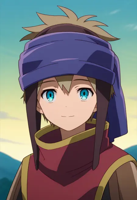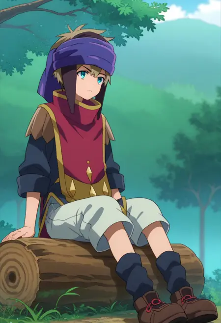 yuumc, 1boy, male focus, solo, blue eyes, brown hair, headband, blue headband, lappet, shirt, black shirt, sleeves rolled up, cape, red cape, shorts, grey shorts, socks, black socks, shoes, brown footwear,