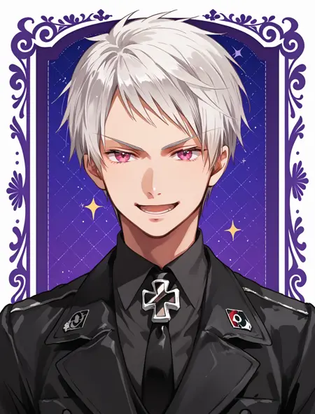 brooch, necktie, black shirt, blue jacket, belt, black gloves, blue pants