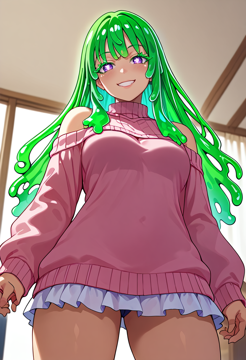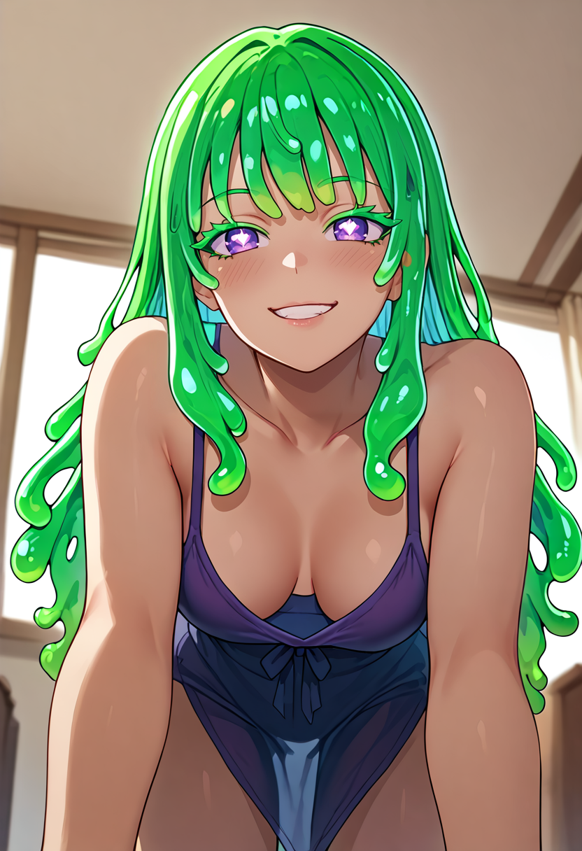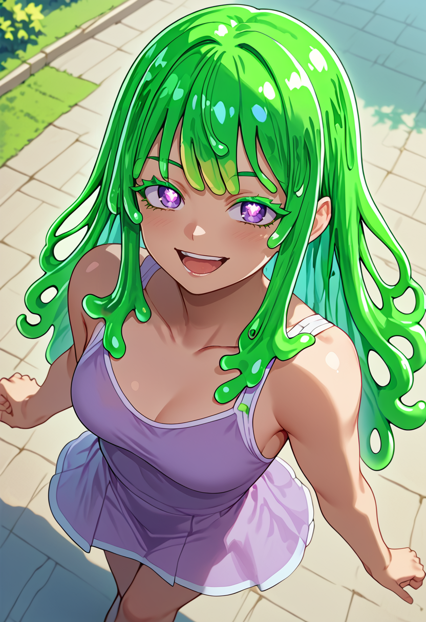 彼女の最も特徴的なのは、すべてスライムでできた髪である。