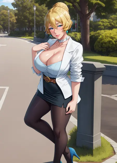 NijouShizue_, solo, mature female, squining, half closed eyes,_blonde hair, short hair, single hair bun, makeup, lipstick, blue eyes, jewelry, earrings, choker__pantyhose, white shirt, pencil skirt (or miniskirt), belt, high heels,