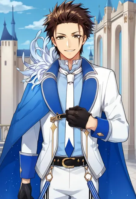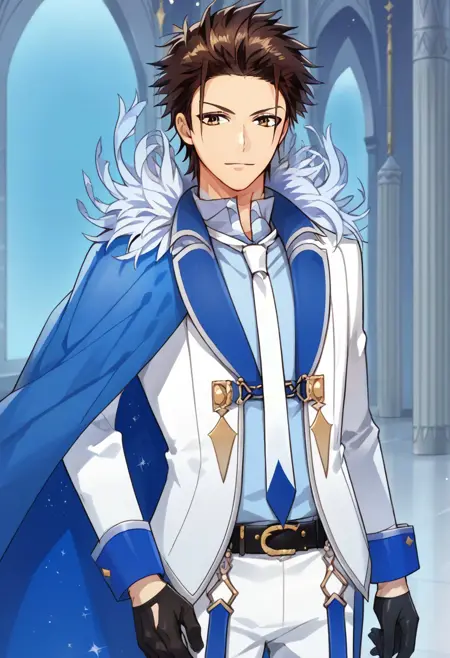 rindo, 1boy, male focus, solo, brown eyes, brown hair, spiked hair, shirt, white shirt, necktie, jacket, white jacket, gloves, black gloves, belt, pants, white pants, cape, blue cape, boots, blue footwear,