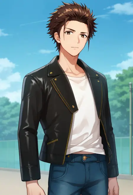 rindo, 1boy, male focus, solo, brown eyes, brown hair, spiked hair, shirt, white shirt, jacket, black jacket, single sleeve, fur trim, pants, black pants, shoes, black footwear, jewelry, necklace,