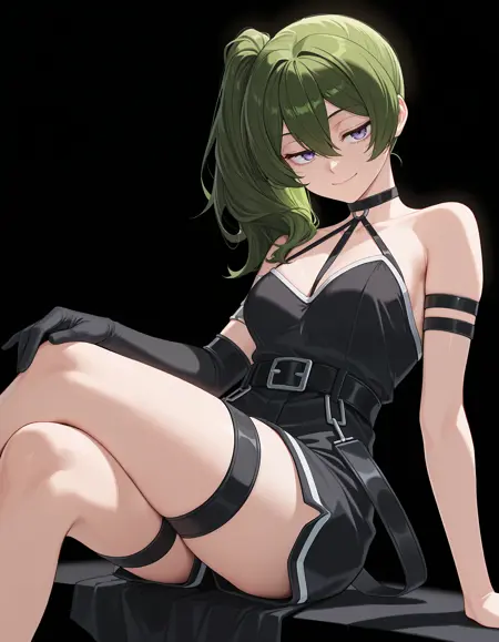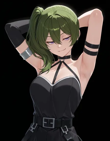 Main Outfit: ub3ldefault, double arm strap, black belt, short black dress, suspenders hanging, thigh straps, o-ring choker, armlet, single elbow glove,