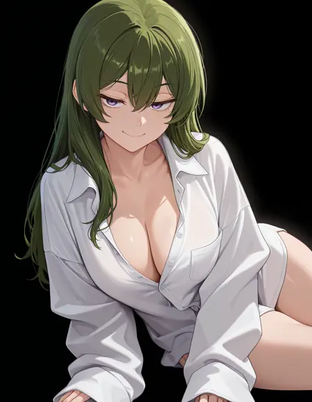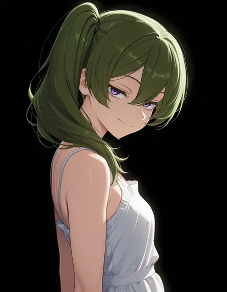 ベース: ub3l、緑の髪、紫の目、長い髪、片側ポニーテール、目の間の髪