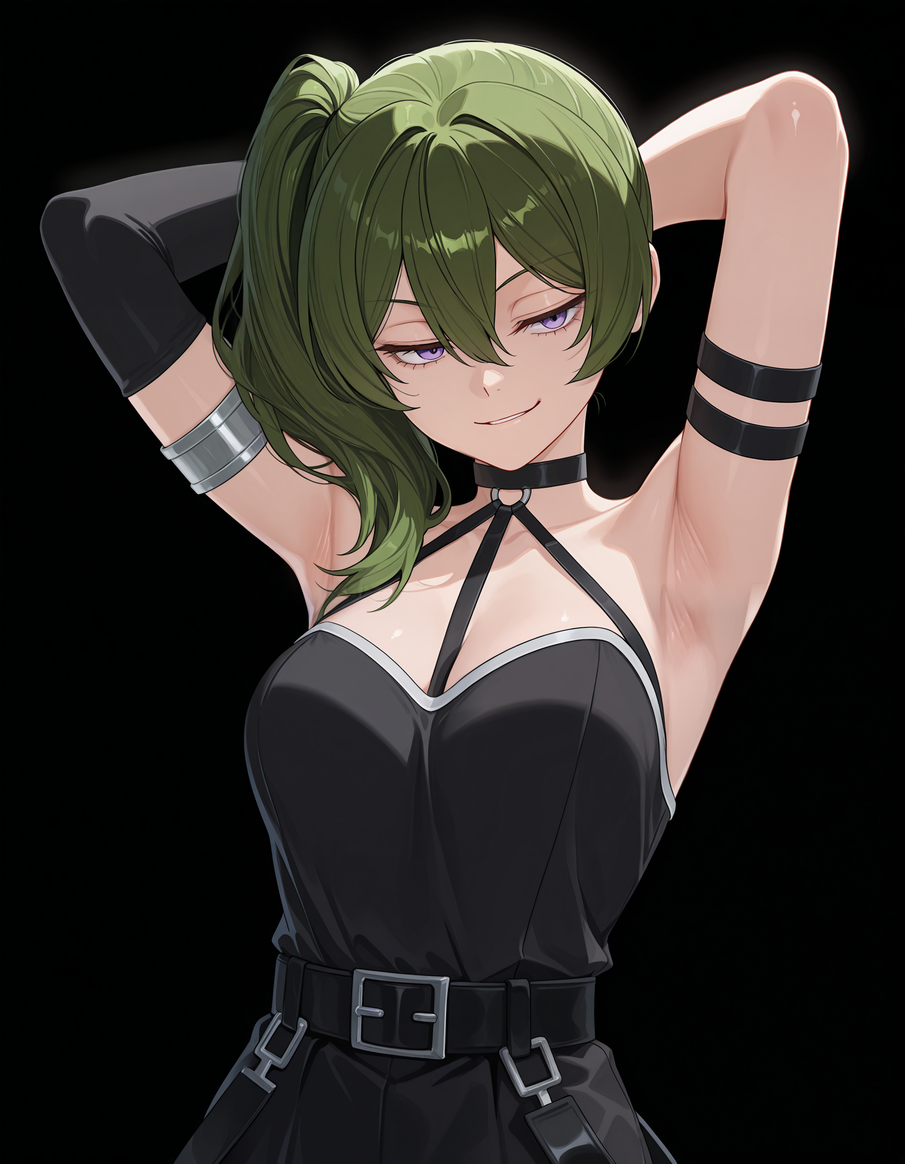 メイン衣装: ub3ldefault、二重腕ストラップ、黒いベルト、短い黒いドレス、吊り下げ式サスペンダー、太ももストラップ、Oリングのチョーカー、腕輪、片方の肘手袋